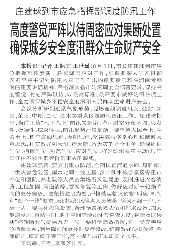 8月8日,市长庄建球到市应急指挥部调度新一轮强降雨应对工作,强调要深入学习贯彻习近平总书记对防汛救灾工作作出的重要指示和在河南考察时的重要讲话精神,严格落实省市防汛调度会部署要求,保持高度警觉,时刻严阵以待,以最高标准、最严要求做好防汛各项工作,全力确保城乡平稳安全度汛和人民群众生命财产安全。(今日《郑州日报》1版)