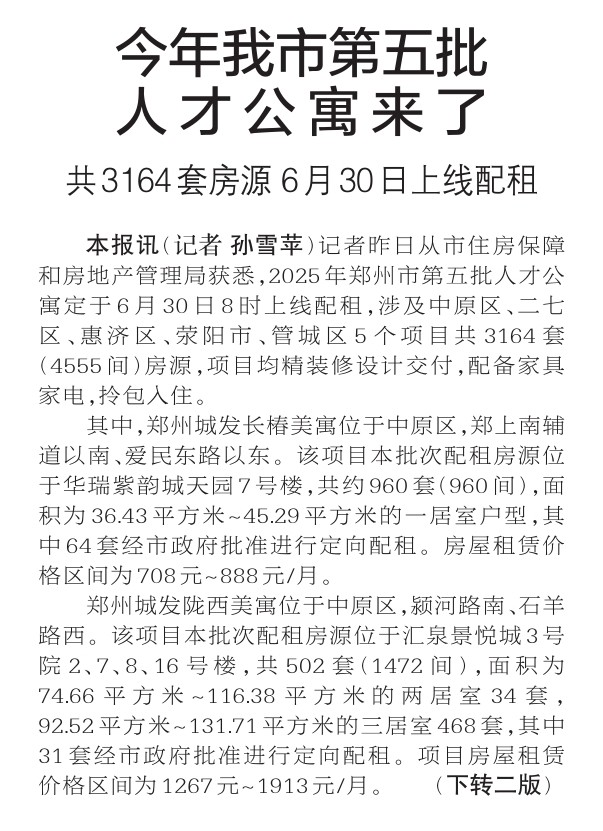 记者昨日从市住房保障和房地产管理局获悉,2025年郑州市第五批人才公寓定于6月30日8时上线配租,涉及中原区、二七区、惠济区、荥阳市、管城区5个项目共3164套(4555间)房源,项目均精装修设计交付,配备家具家电,拎包入住。(今日《郑州日报》1版、2版)