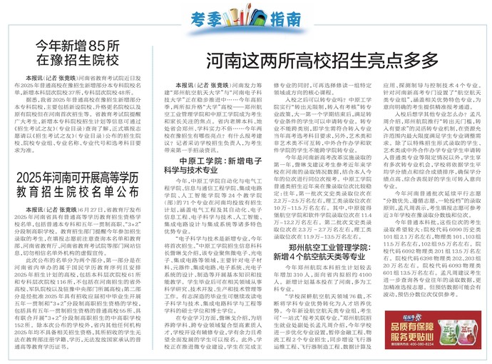 河南发力筹建“郑州航空航天大学”与“河南电子科技大学”正在稳步推进中……今年高招季,两所拟升格“大学”高校——郑州航空工业管理学院和中原工学院成为考生和家长关注的焦点。省内老牌本科、地处省会郑州、学科实力不俗……今年两校在豫招生有哪些亮点?有什么报考建议?记者采访学校招生负责人,为考生带来第一手招录资讯。(今日《郑州日报》2版)