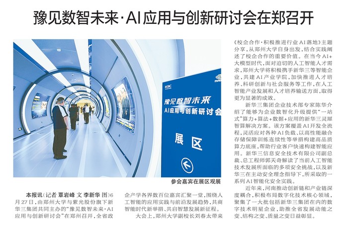 6月27日,由郑州大学与紫光股份旗下新华三集团共同主办的“豫见数智未来·AI应用与创新研讨会”在郑州召开,全省政企产学各界数百位嘉宾汇聚一堂,围绕人工智能的应用实践与前沿发展趋势,共商智能时代新举措、共启智慧发展新征程。(今日《郑州日报》2版)