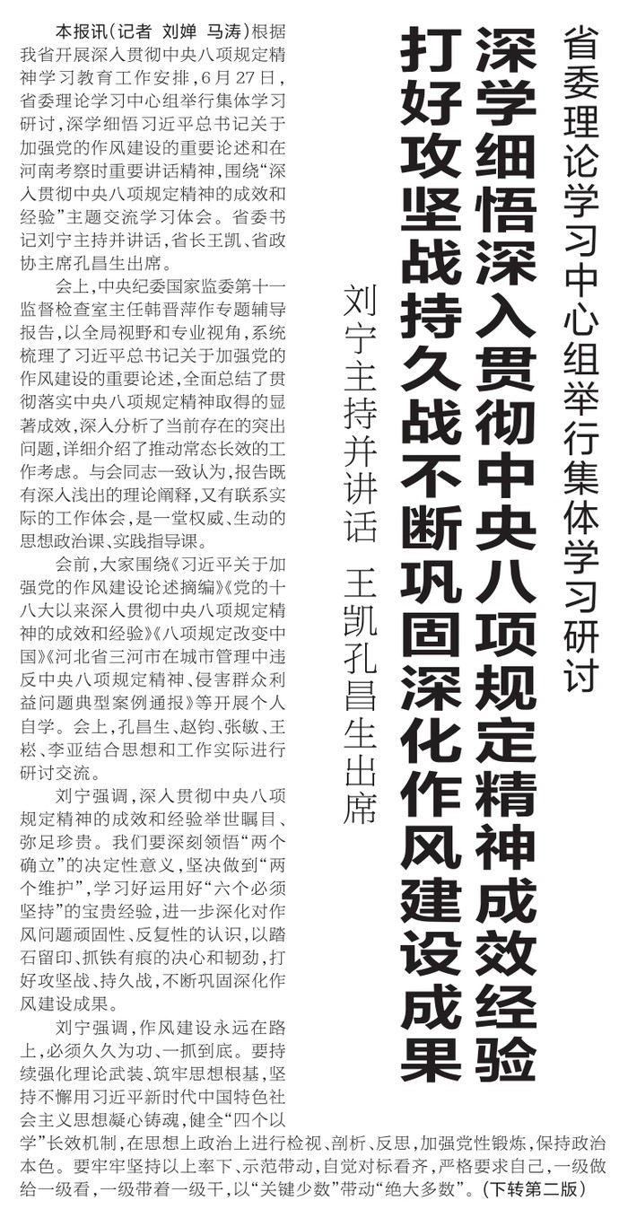 根据我省开展深入贯彻中央八项规定精神学习教育工作安排,6月27日,省委理论学习中心组举行集体学习研讨,深学细悟习近平总书记关于加强党的作风建设的重要论述和在河南考察时重要讲话精神,围绕“深入贯彻中央八项规定精神的成效和经验”主题交流学习体会。省委书记刘宁主持并讲话,省长王凯、省政协主席孔昌生出席。(今日《河南日报》1版、2版)