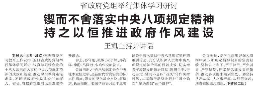 根据省委学习教育工作安排,近日省政府党组举行集体学习研讨,认真学习领会党的十八大以来深入贯彻中央八项规定精神的成效和经验,推动学习教育走深走实,不断把政府作风建设引向深入。省长、省政府党组书记王凯主持并讲话。(今日《河南日报》1版、2版)