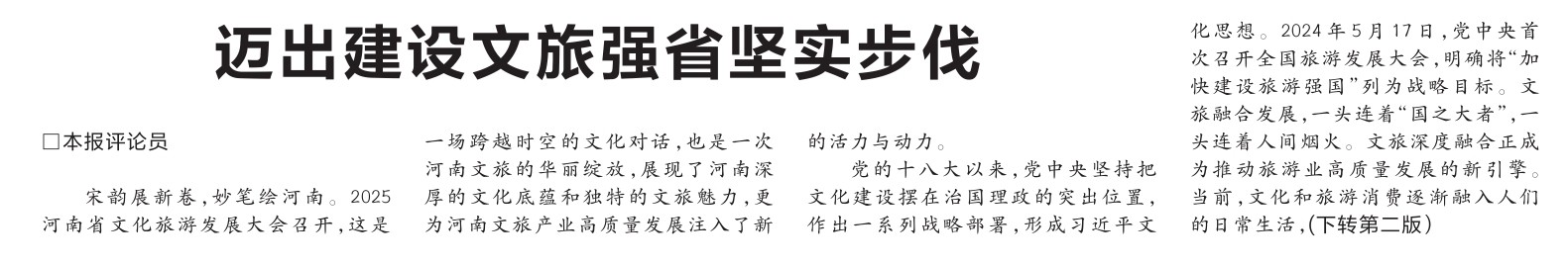 宋韵展新卷,妙笔绘河南。2025河南省文化旅游发展大会召开,这是一场跨越时空的文化对话,也是一次河南文旅的华丽绽放,展现了河南深厚的文化底蕴和独特的文旅魅力,更为河南文旅产业高质量发展注入了新的活力与动力。(今日《河南日报》1版、2版)