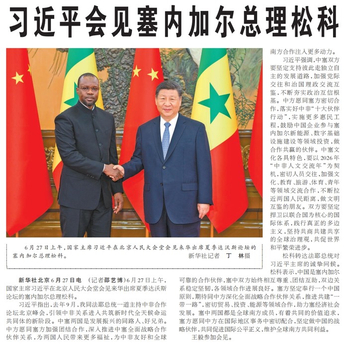 6月27日上午,国家主席习近平在北京人民大会堂会见来华出席夏季达沃斯论坛的塞内加尔总理松科。(今日《人民日报》1版)