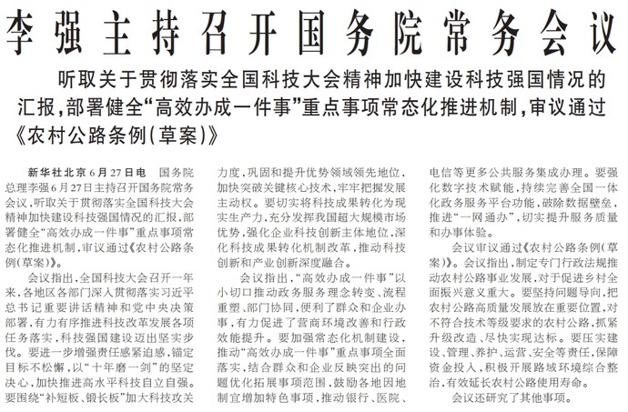 国务院总理李强6月27日主持召开国务院常务会议,听取关于贯彻落实全国科技大会精神加快建设科技强国情况的汇报,部署健全“高效办成一件事”重点事项常态化推进机制,审议通过《农村公路条例(草案)》。(今日《人民日报》1版)
