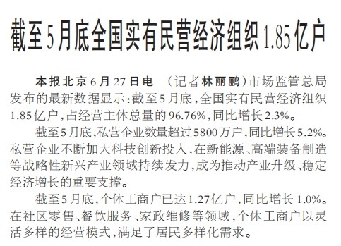 截至5月底全国实有民营经济组织1.85亿户
