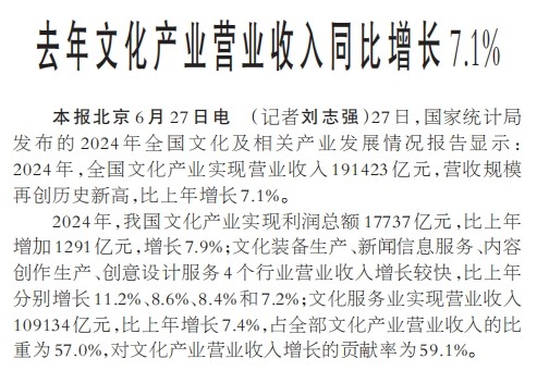 27日,国家统计局发布的2024年全国文化及相关产业发展情况报告显示:2024年,全国文化产业实现营业收入191423亿元,营收规模再创历史新高,比上年增长7.1%。(今日《人民日报》1版)