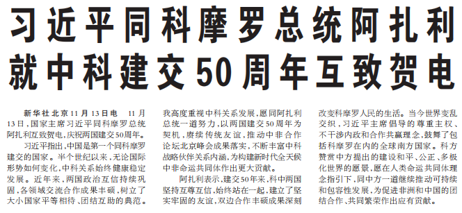11月13日,国家主席习近平同科摩罗总统阿扎利互致贺电,庆祝两国建交50周年。(今日《人民日报》1版)