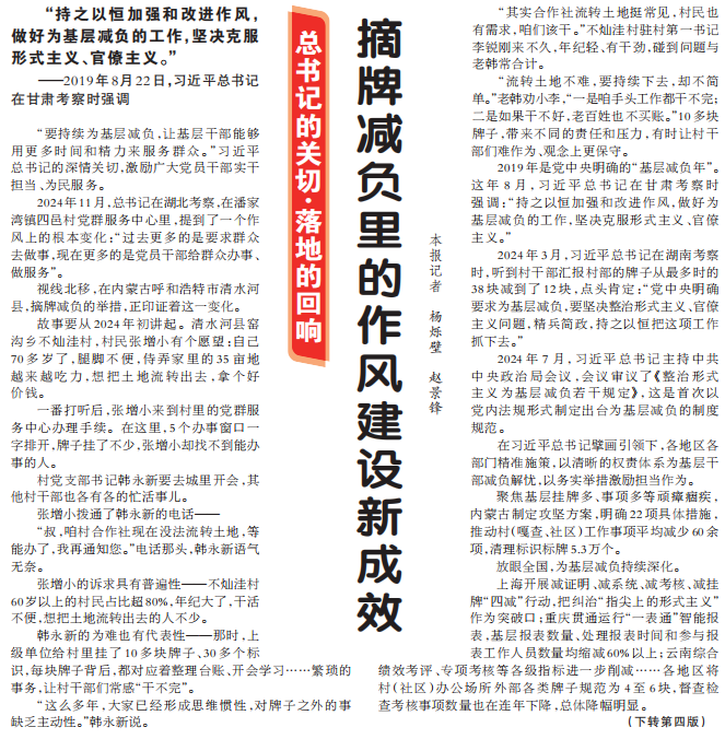 “要持续为基层减负,让基层干部能够用更多时间和精力来服务群众。”习近平总书记的深情关切,激励广大党员干部实干担当、为民服务。(今日《人民日报》1版、4版)