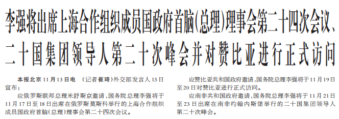 李强将出席上海合作组织成员国政府首脑(总理)理事会第二十四次会议、二十国集团领导人第二十次峰会并对赞比亚进行正式访问