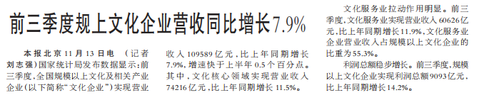 国家统计局发布数据显示:前三季度,全国规模以上文化及相关产业企业实现营业收入109589亿元,比上年同期增长7.9%,增速快于上半年0.5个百分点。其中,文化核心领域实现营业收入74216亿元,比上年同期增长11.5%。(今日《人民日报》1版)