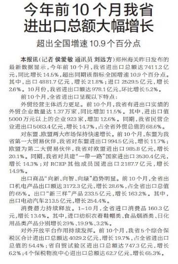 郑州海关昨日发布的最新数据显示,今年前10个月,我省进出口总额达7411.2亿元,同比增长14.5%,超出同期该指标全国增速10.9个百分点。其中,出口4881.7亿元,增长21.8%;进口2529.5亿元,增长2.6%。10月份,我省进出口额达978.1亿元,环比增长5.2%。(今日《郑州日报》1版)