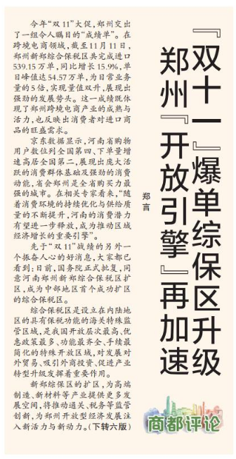 “双十一”爆单综保区升级 郑州“开放引擎”再加速