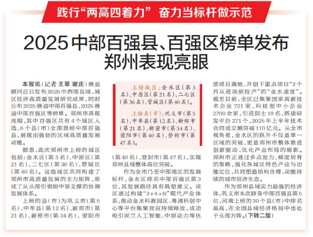 赛迪顾问近日发布2025中西部县域、城区经济高质量发展研究成果,同时公布2025赛迪中部百强县、2025赛迪中部百强区等榜单。郑州市表现亮眼,其中百强区共有4个城区入选,6个县(市)全部登榜中部百强县,展现出强劲的区域高质量发展动能。(今日《郑州日报》1版、2版)