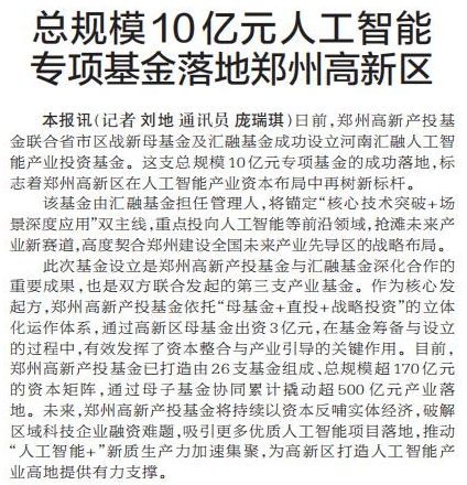 日前,郑州高新产投基金联合省市区战新母基金及汇融基金成功设立河南汇融人工智能产业投资基金。这支总规模10亿元专项基金的成功落地,标志着郑州高新区在人工智能产业资本布局中再树新标杆。(今日《郑州日报》1版)