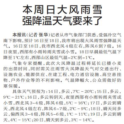 记者从市气象部门获悉,受强冷空气南下影响,预计16日至18日,我市将出现大风雨雪强降温天气。16日至18日,我市西北风4级左右,阵风6到7级。16日夜里,西部有小雨转雨夹雪或小雪。18日早晨最低气温下降至1℃左右,西部山区最低气温-2℃到-1℃。(今日《郑州日报》1版)