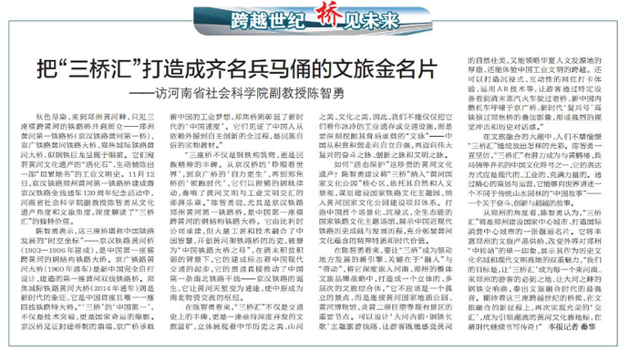 秋色尽染,来到郑州黄河畔,只见三座横跨黄河的铁路桥并肩而立——郑州黄河第一铁路桥(京汉铁路黄河第一桥)、京广铁路黄河铁路大桥、郑焦城际铁路黄河大桥,似钢铁巨龙呈现于眼前。它们宛若黄河文化遗产的“活化石”,生动铺陈出一部“层累地书”的工业文明史。11月12日,京汉铁路郑州黄河第一铁路桥建成暨京汉铁路全线通车120周年纪念活动中,河南省社会科学院副教授陈智勇从文化遗产角度和文旅角度,深度解读了“三桥汇”的独特价值。(今日《郑州日报》2版)