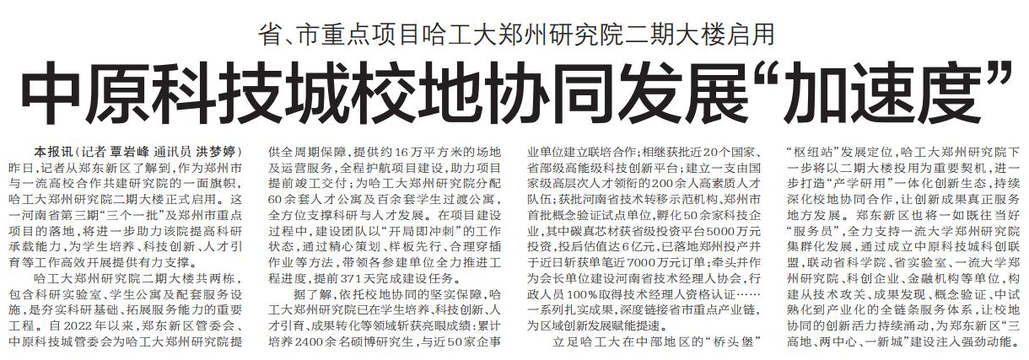 昨日,记者从郑东新区了解到,作为郑州市与一流高校合作共建研究院的一面旗帜,哈工大郑州研究院二期大楼正式启用。这一河南省第三期“三个一批”及郑州市重点项目的落地,将进一步助力该院提高科研承载能力,为学生培养、科技创新、人才引育等工作高效开展提供有力支撑。(今日《郑州日报》7版)