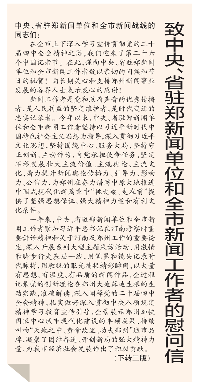 在全市上下深入学习宣传贯彻党的二十届四中全会精神之际,我们迎来了第二十六个中国记者节。在此,谨向中央、省驻郑新闻单位和全市新闻工作者致以亲切的问候和节日的祝贺!向长期关心和支持郑州新闻事业发展的各界人士表示衷心的感谢!(今日《郑州日报》1版、2版)