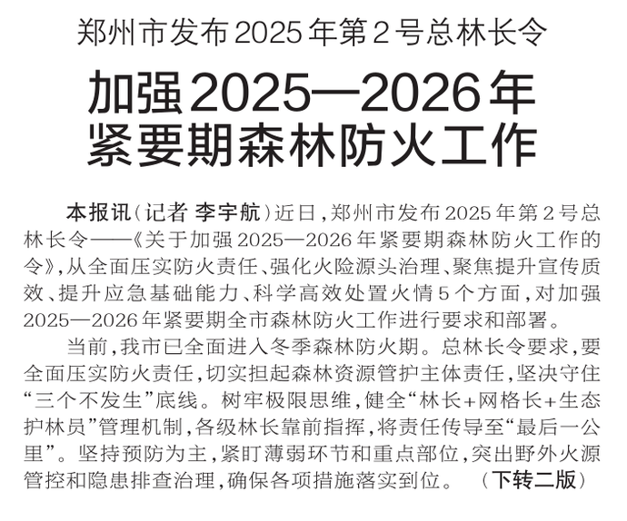 近日,郑州市发布2025年第2号总林长令——《关于加强2025—2026年紧要期森林防火工作的令》,从全面压实防火责任、强化火险源头治理、聚焦提升宣传质效、提升应急基础能力、科学高效处置火情5个方面,对加强2025—2026年紧要期全市森林防火工作进行要求和部署。(今日《郑州日报》1版、2版)