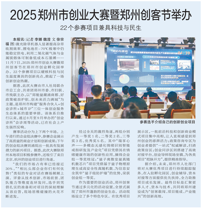 激光除草机器人显著提高杂草收割效率、锂电池在-70℃极寒中仍能稳定供电、利用二氧化碳气体与金属镁熔体可制备低成本石墨烯……11月7日,2025郑州市创业大赛暨郑州创客节在郑州市创业孵化园举办。22个参赛项目以硬核科技与民生温度兼具的创新亮点,掀起了一场创新创业热潮。(今日《郑州日报》2版)