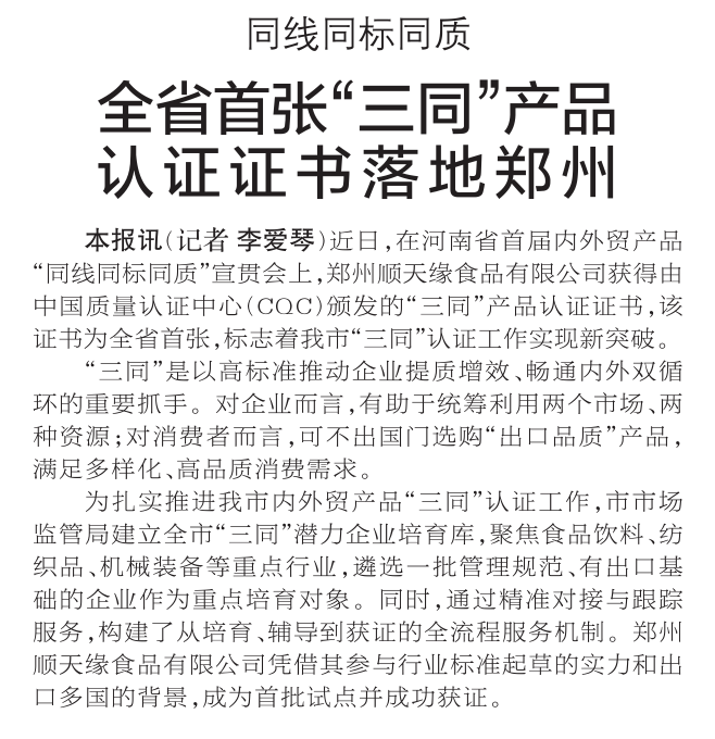 近日,在河南省首届内外贸产品“同线同标同质”宣贯会上,郑州顺天缘食品有限公司获得由中国质量认证中心(CQC)颁发的“三同”产品认证证书,该证书为全省首张,标志着我市“三同”认证工作实现新突破。(今日《郑州日报》2版)