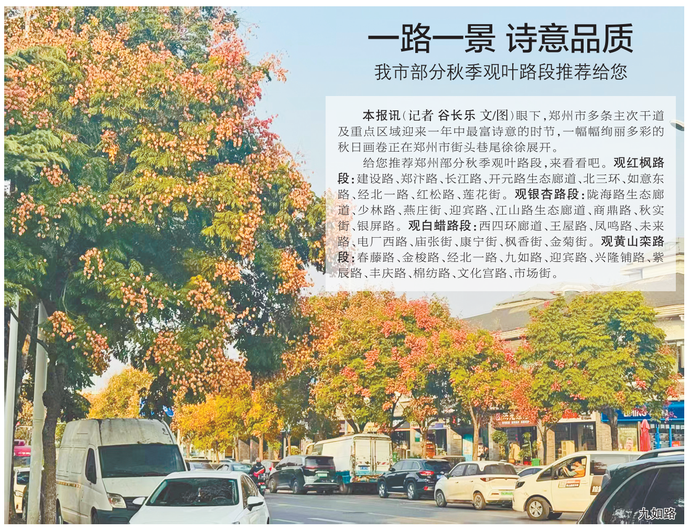 眼下,郑州市多条主次干道及重点区域迎来一年中最富诗意的时节,一幅幅绚丽多彩的秋日画卷正在郑州市街头巷尾徐徐展开。(今日《郑州日报》2版)