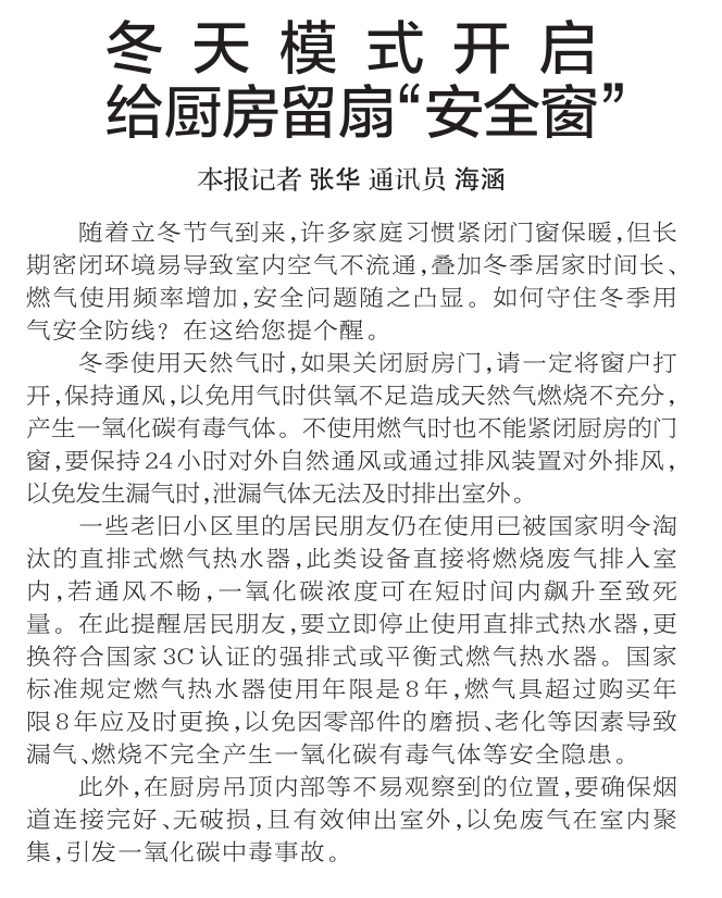 随着立冬节气到来,许多家庭习惯紧闭门窗保暖,但长期密闭环境易导致室内空气不流通,叠加冬季居家时间长、燃气使用频率增加,安全问题随之凸显。如何守住冬季用气安全防线?在这给您提个醒。(今日《郑州日报》2版)