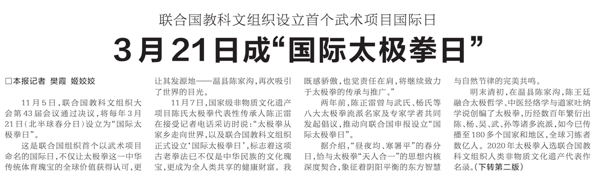 11月5日,联合国教科文组织大会第43届会议通过决议,将每年3月21日(北半球春分日)设立为“国际太极拳日”。(今日《河南日报》1版、2版)