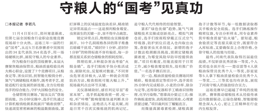 11月4日至6日,郑州寒意渐浓,但第七届全国粮食行业职业技能竞赛现场却十分火热。这场三年一届的行业“国考”,从近5万名参赛者中突围而出的34支代表队354名选手,用一场场硬核比拼,展现守粮人的专业素养。(今日《河南日报》2版)