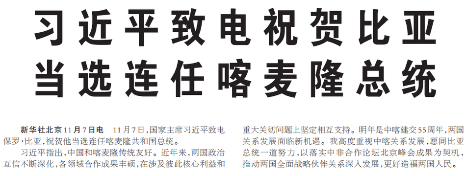 11月7日,国家主席习近平致电保罗·比亚,祝贺他当选连任喀麦隆共和国总统。(今日《人民日报》1版)