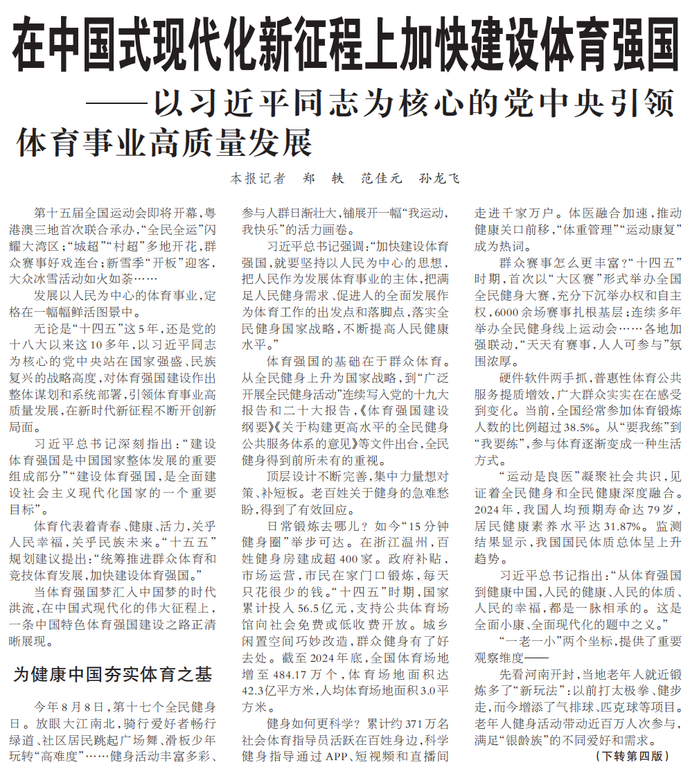 第十五届全国运动会即将开幕,粤港澳三地首次联合承办,“全民全运”闪耀大湾区;“城超”“村超”多地开花,群众赛事好戏连台;新雪季“开板”迎客,大众冰雪活动如火如荼……(今日《人民日报》1版、4版)