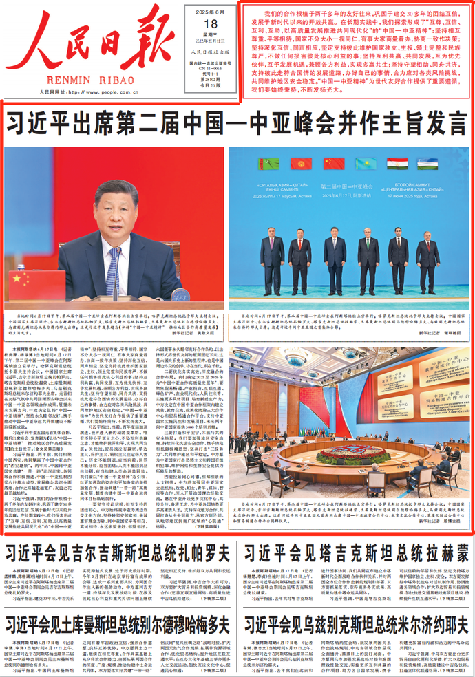 当地时间6月17日下午,第二届中国—中亚峰会在阿斯塔纳独立宫举行。哈萨克斯坦总统托卡耶夫主持会议。中国国家主席习近平、吉尔吉斯斯坦总统扎帕罗夫、塔吉克斯坦总统拉赫蒙、土库曼斯坦总统别尔德穆哈梅多夫、乌兹别克斯坦总统米尔济约耶夫出席。元首们在友好气氛中共同回顾西安峰会以来中国—中亚各领域合作成果,展望未来发展方向,一致决定弘扬“中国—中亚精神”,坚持永久睦邻友好,携手推动中国—中亚命运共同体建设不断取得新成就。(今日《人民日报》1版、4版)
