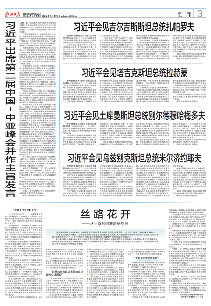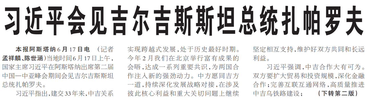 当地时间6月17日上午,国家主席习近平在阿斯塔纳出席第二届中国—中亚峰会期间会见吉尔吉斯斯坦总统扎帕罗夫。(今日《人民日报》1版、2版)