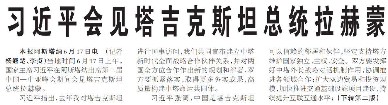 当地时间6月17日上午,国家主席习近平在阿斯塔纳出席第二届中国—中亚峰会期间会见塔吉克斯坦总统拉赫蒙。(今日《人民日报》1版、2版)