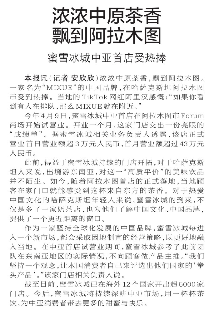 浓浓中原茶香,飘到阿拉木图。一家名为“MIXUE”的中国品牌,在哈萨克斯坦阿拉木图市受到热捧。当地的TikTok网红阿里汉感慨:“如果你看到有人在排队,那么MIXUE就在附近。”(今日《郑州日报》1版)