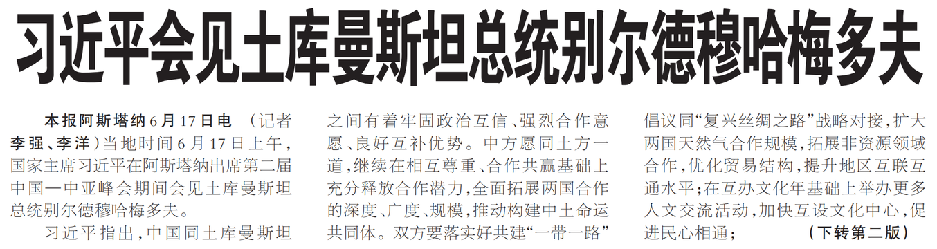 当地时间6月17日上午,国家主席习近平在阿斯塔纳出席第二届中国—中亚峰会期间会见土库曼斯坦总统别尔德穆哈梅多夫。(今日《人民日报》1版、2版)