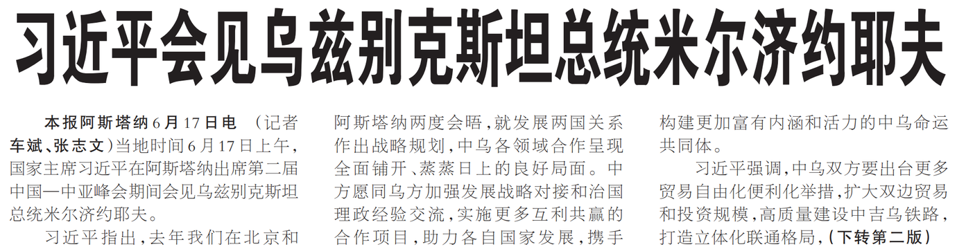 当地时间6月17日上午,国家主席习近平在阿斯塔纳出席第二届中国—中亚峰会期间会见乌兹别克斯坦总统米尔济约耶夫。(今日《人民日报》1版、2版)