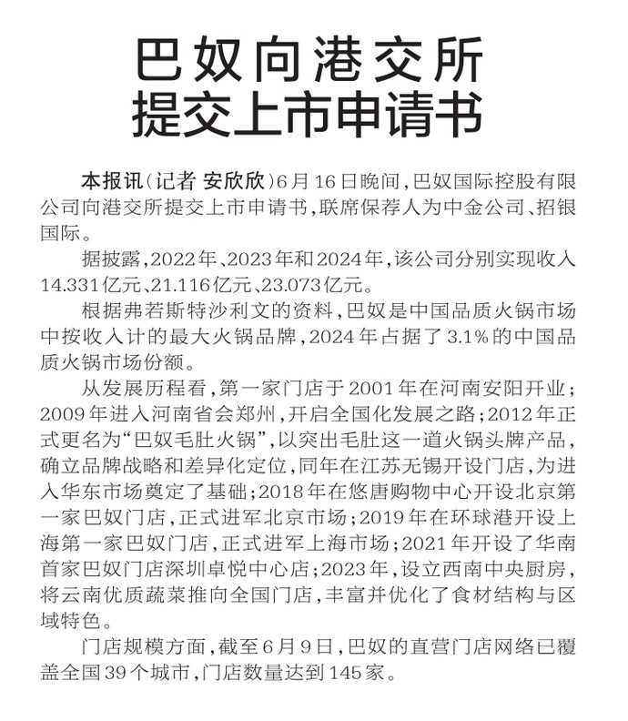 6月16日晚间,巴奴国际控股有限公司向港交所提交上市申请书,联席保荐人为中金公司、招银国际。(今日《郑州日报》1版)