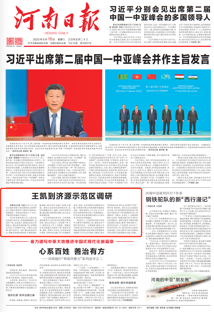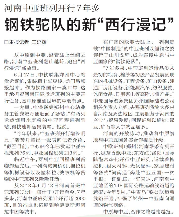 从中原到中亚,沿着陆上丝绸之路,河南中亚班列翻山越岭,跑出“西行漫记”新故事。(今日《河南日报》1版)