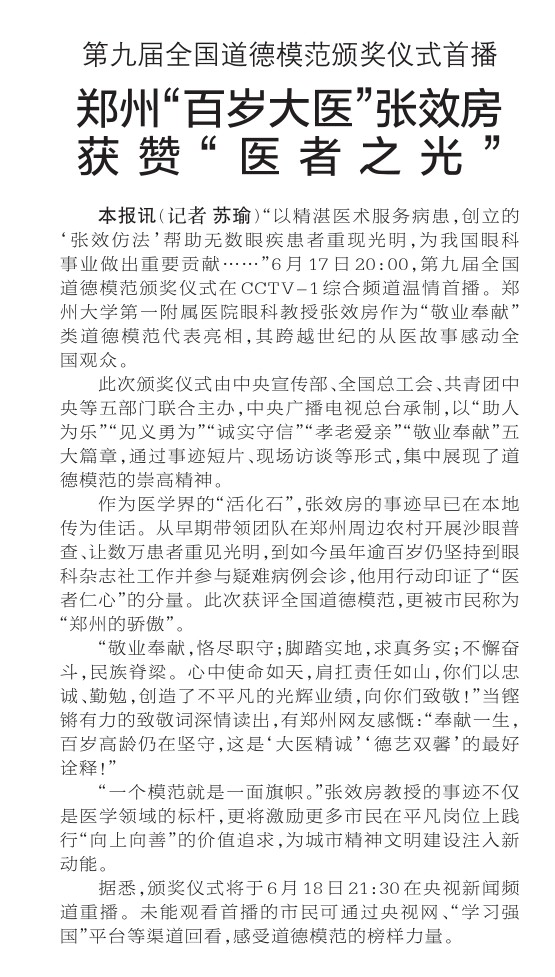 “以精湛医术服务病患,创立的‘张效仿法’帮助无数眼疾患者重现光明,为我国眼科事业做出重要贡献……”6月17日20:00,第九届全国道德模范颁奖仪式在CCTV-1综合频道温情首播。郑州大学第一附属医院眼科教授张效房作为“敬业奉献”类道德模范代表亮相,其跨越世纪的从医故事感动全国观众。(今日《郑州日报》2版)