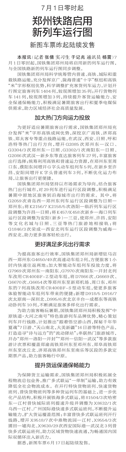7月1日零时起,国铁集团郑州局将启用新的列车运行图,与全国铁路新的列车运行图同步调整。(今日《郑州日报》2版)