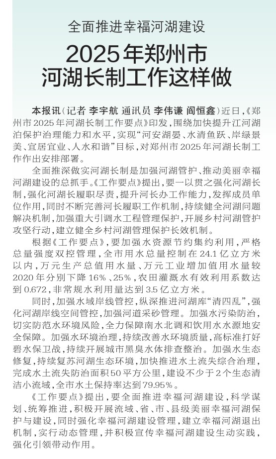 近日,《郑州市2025年河湖长制工作要点》印发,围绕加快提升江河湖泊保护治理能力和水平,实现“河安湖晏、水清鱼跃、岸绿景美、宜居宜业、人水和谐”目标,对郑州市2025年河湖长制工作作出安排部署。(今日《郑州日报》2版)