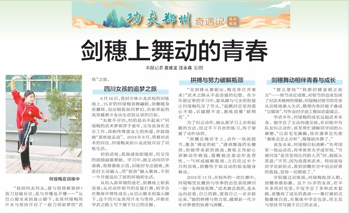 “我剑何去何从,爱与恨情难独钟!我刀划破长空,是与非懂也不懂……”从巴山蜀水来到嵩山脚下,女孩何垭梅用汗水与坚持开启了一段刀剑如梦的“武侠”之旅。(今日《郑州日报》8版)