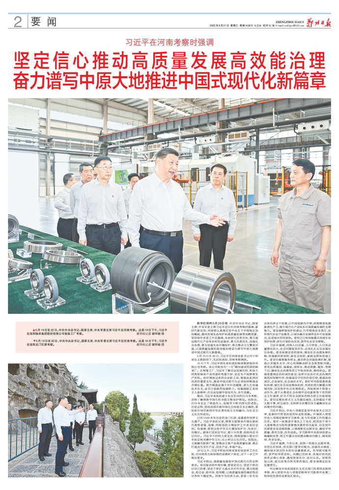 孟夏时节,中原大地麦浪滚滚、金穗飘香。在以中国式现代化全面推进强国建设、民族复兴伟业的关键时期,在全党深入贯彻中央八项规定精神学习教育开展之际,习近平总书记再次亲临河南视察指导,为我省发展把脉定向、指路引航,为我们做好各项工作提供了根本遵循和行动指南。(今日《河南日报》5版)
