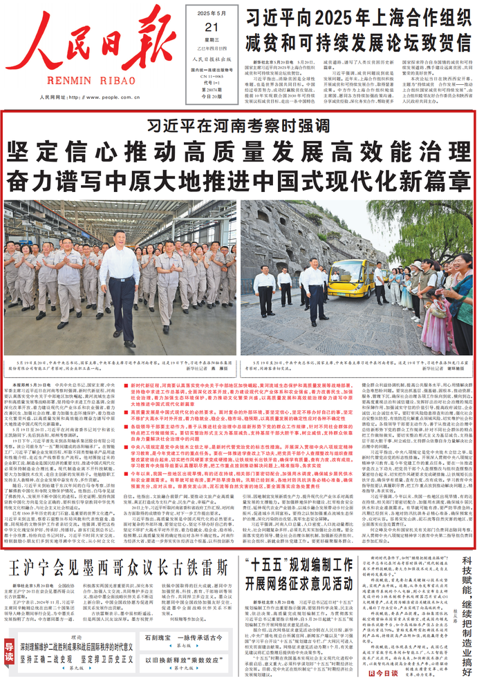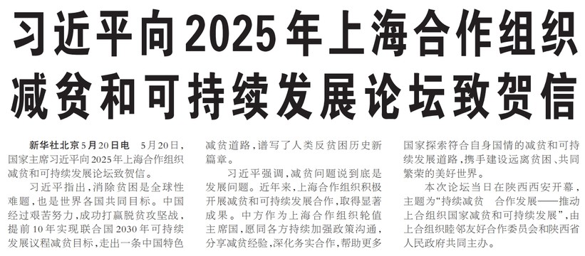 5月20日,国家主席习近平向2025年上海合作组织减贫和可持续发展论坛致贺信。(今日《人民日报》1版)