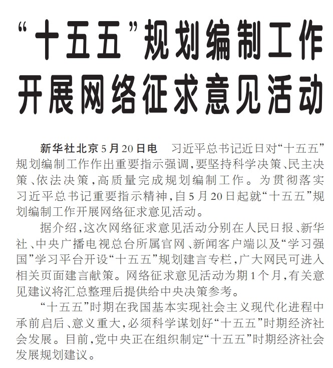 习近平总书记近日对“十五五”规划编制工作作出重要指示强调,要坚持科学决策、民主决策、依法决策,高质量完成规划编制工作。为贯彻落实习近平总书记重要指示精神,自5月20日起就“十五五”规划编制工作开展网络征求意见活动。(今日《人民日报》1版)