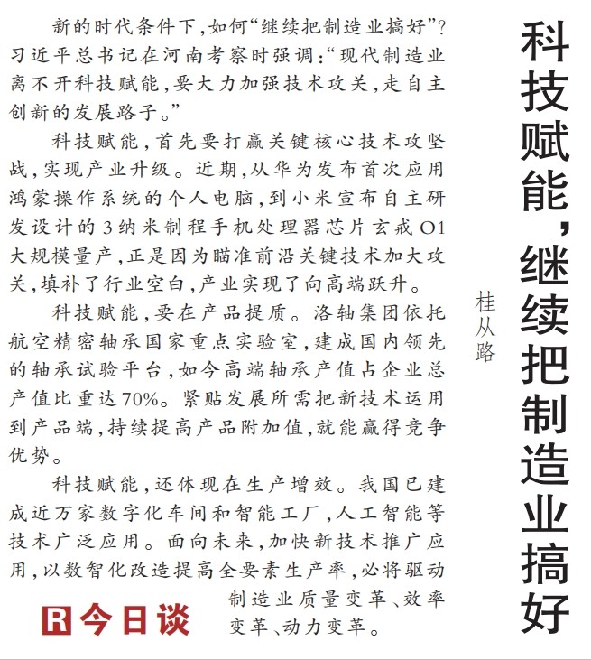 “制造业是国民经济的重要支柱,推进中国式现代化必须保持制造业合理比重。”(今日《河南日报》3版)