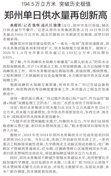 郑州单日供水量再创新高