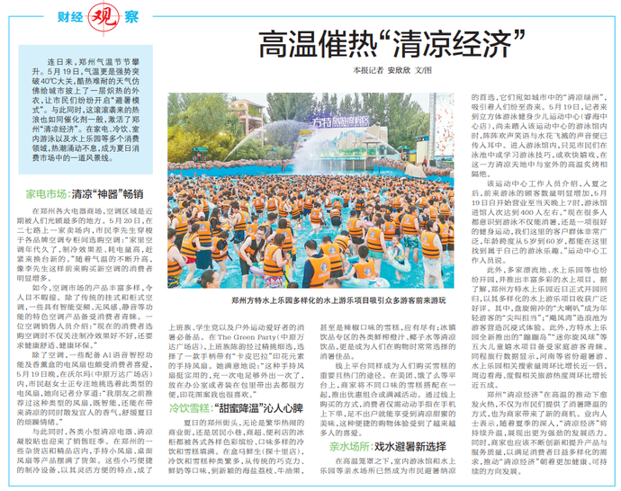 连日来,郑州气温节节攀升。5月19日,气温更是强势突破40℃大关,酷热难耐的天气仿佛给城市披上了一层炽热的外衣,让市民们纷纷开启“避暑模式”。与此同时,这滚滚袭来的热浪也如同催化剂一般,激活了郑州“清凉经济”。在家电、冷饮、室内游泳以及水上乐园等多个消费领域,热潮涌动不息,成为夏日消费市场中的一道风景线。(今日《郑州日报》6版)
